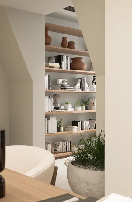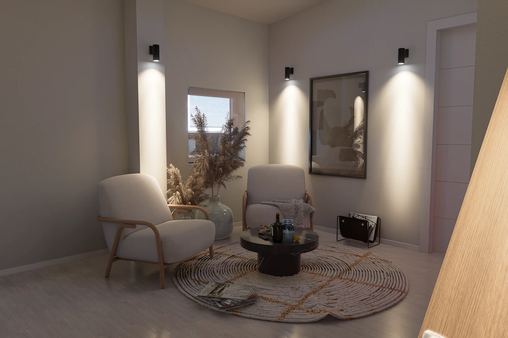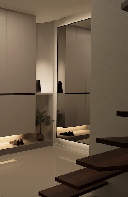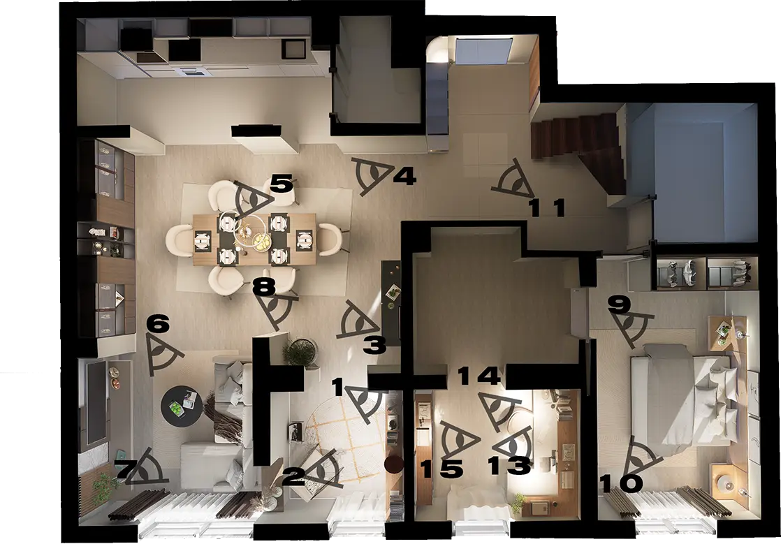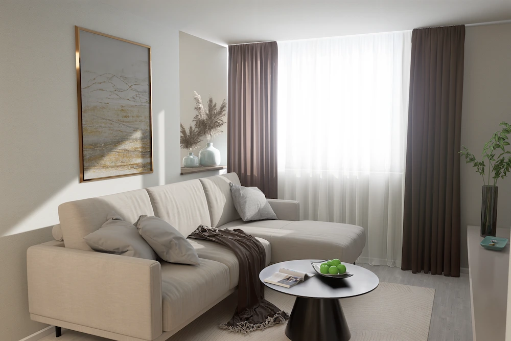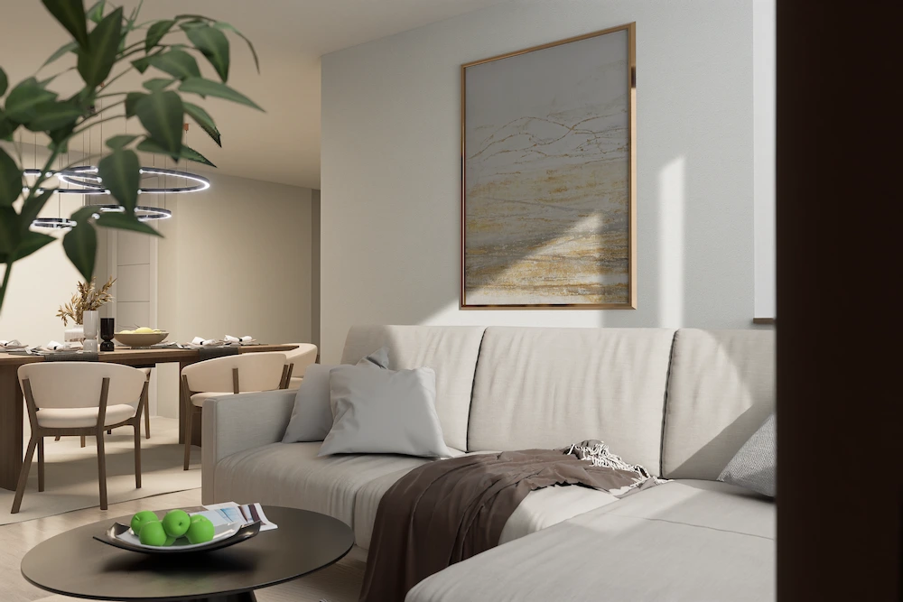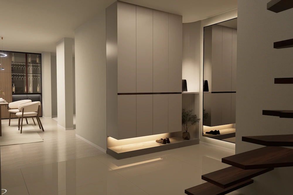 Ulazni prostor poziva vas unutra svojim minimalističkim, ali sofisticiranim detaljima. Kada zakoračite u dnevni boravak, osjećate kako prostor diše s vama. Visoki prozori propuštaju obilje svjetlosti, dok otvoreni plan pruža slobodu za prilagodbu. Ovo je srce doma – prostor za okupljanje, stvaranje i opuštanje.